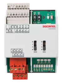 Output modules with local override combine electrical outputs with the possibility of manual intervention. They are designed for installation in a control cabinet (top hat rail). ems4.DAH3E is a module for switching up 2 x 2-stage relay outputs with an additional local override. It serves as an extension module for automation equipment of the DIGICONTROL ems series. The module’s software enables the processing of all signals in the automatic and manual mode. Furthermore, additional functions (processing of the fault signal inputs, command execution control...) are performed by the module software.