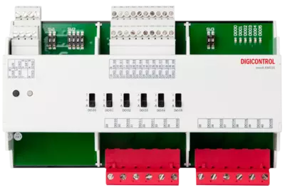 The ems4.KM02E is equipped with 10 multifunctional inputs which serve, depending on the specific needs, as analogue, digital or temperature sensor input. Temperature sensors of type PT1000, NI1000 (DIN) or NI1000 (TKR5000) can be connected. The analogue (0...10V) signal can additionally be scaled. If the inputs is used as digital input, it can be differentiated between a switching signal (ON/OFF) and a push button. In addition, there is the possibility to switch the digital outputs (DIO) via the digital inputs (DII). In addition to the input signals the ems4.KM02E module has 6 digital outputs. The control of the digital output by a different input module (DE0xB) is possible. The state of the digital outputs is displayed in the status LEDs on the module. All physical outputs can be changed with the local priority control. Therefore, the slide switch outputs with the positions AUTO-0-I are available. The positions of the slide switch can be commicated through the ems4.KM02E via the CAN bus to the connected components. The relay outputs can be used as a 3-phase switching signal. The configuration is done via DIP switches. The relay outputs can be configured as a 3-point output or shutter control. The individual adjustment of the PLC is done by different module parameters.