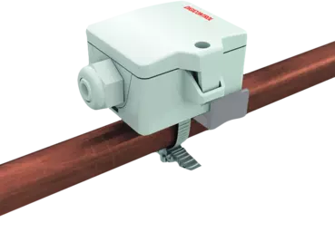 The contact temperature sensor F-ALTF-T in the hinged cover housing is used to measure the temperature on pipes and curved surfaces. The measuring element is pressed onto the measuring surface by a spring mechanism to achieve direct contact and fast response. Designed for connection to controller and display systems.