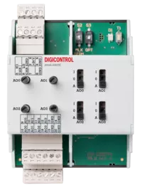 ems4.AAH3E ist ein Modul zur Ausgabe von Analogspannungen 4 x 0...10 V DC mit zusätzlicher lokaler Vorrang-Bedienebene. Es dient als Erweiterungsmodul für Automationseinrichtungen der Baureihe DIGICONTROL ems. Die Software des Moduls ermöglicht die Verarbeitung sämtlicher Signale im Automatik- und Handbetrieb. Darüber hinaus werden zusätzliche Funktionen (z.B. Wertangleichung, Befehlsausführkontrolle, usw.) durch die Modulsoftware durchgeführt. Ausgangsmodule mit lokaler VorrangBedienebene vereinen elektrische Ausgänge mit der Möglichkeit eines manuellen Eingriffs. Sie sind für den Einbau im Schaltschrank (Hutschiene) konzipiert.
