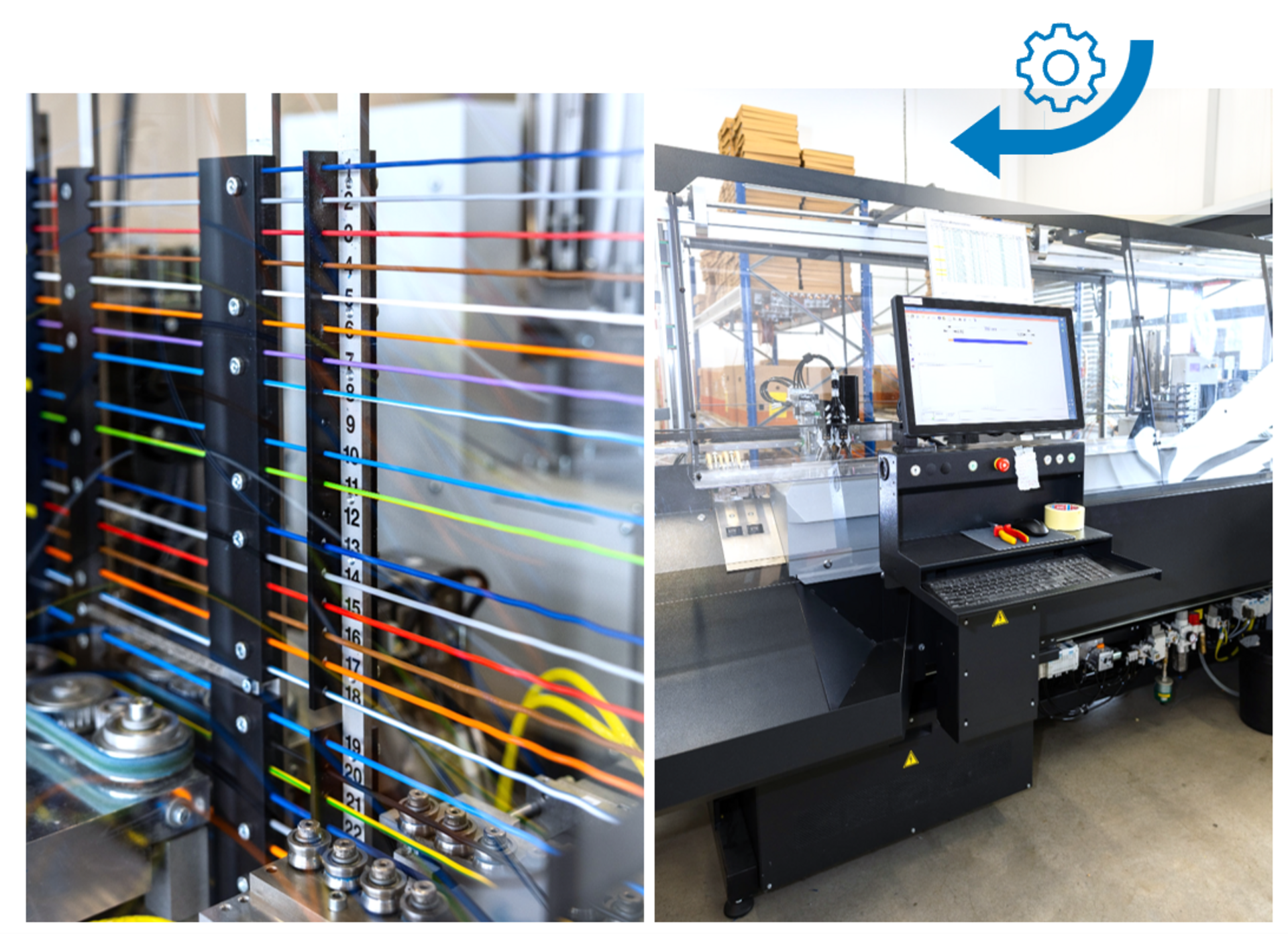 Die automatisierte, maschinelle Kabelkonfektionierung schneidet, beschriftet und crimpt die elektrischen Leitungen präzise und reproduzierbar. Sie sorgt durch exakte Kabellängen für die effizienteste Nutzung der Kabelkanäle, eine fehlerfreie Verdrahtung und Dokumentation. Die Fertigung der Türen und Montageplatten erfolgt ebenfalls automatisiert durch CNC-gesteuerte Produktionsmaschinen.