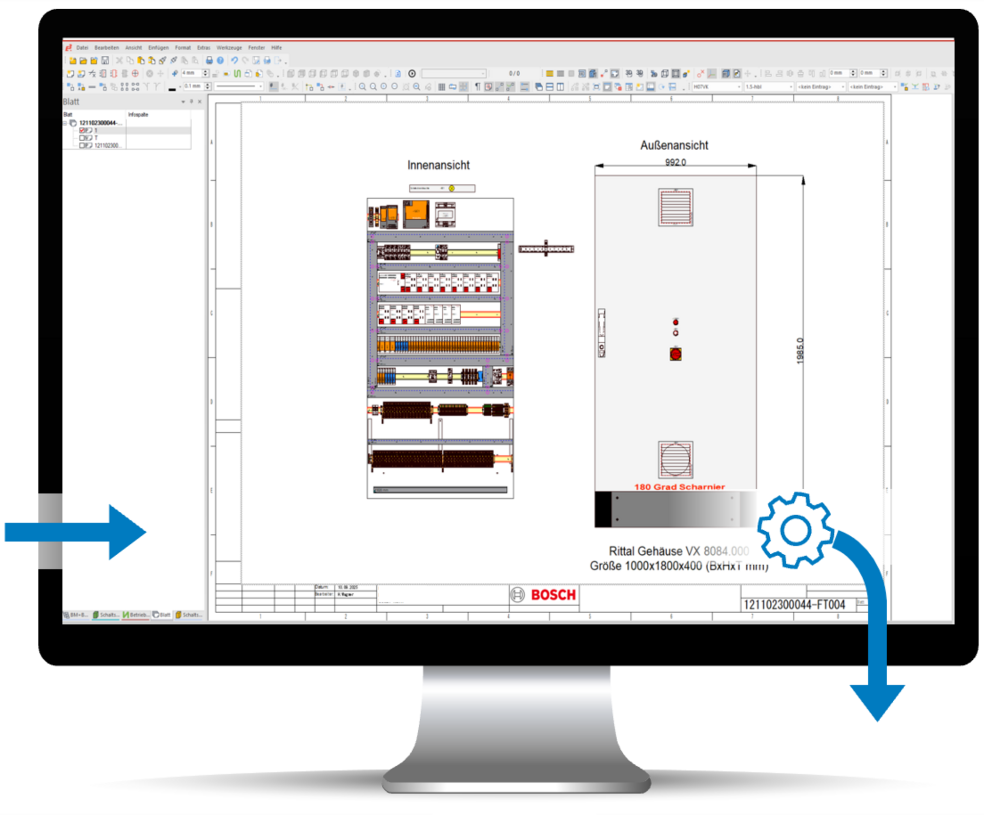 Der digitalisierte Stromlaufplan und weitere Schaltschrankdaten werden in die Schaltschrank-Engineering-Umgebung überführt. Diese generiert optimierte, 2D- und 3D-visualisierte Montage- und Bestückungspläne der Gehäuse, Türen und Grundplatten sowie die Parameter zur Einrichtung der automatisierten Kabelkonfektionierung.